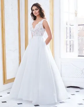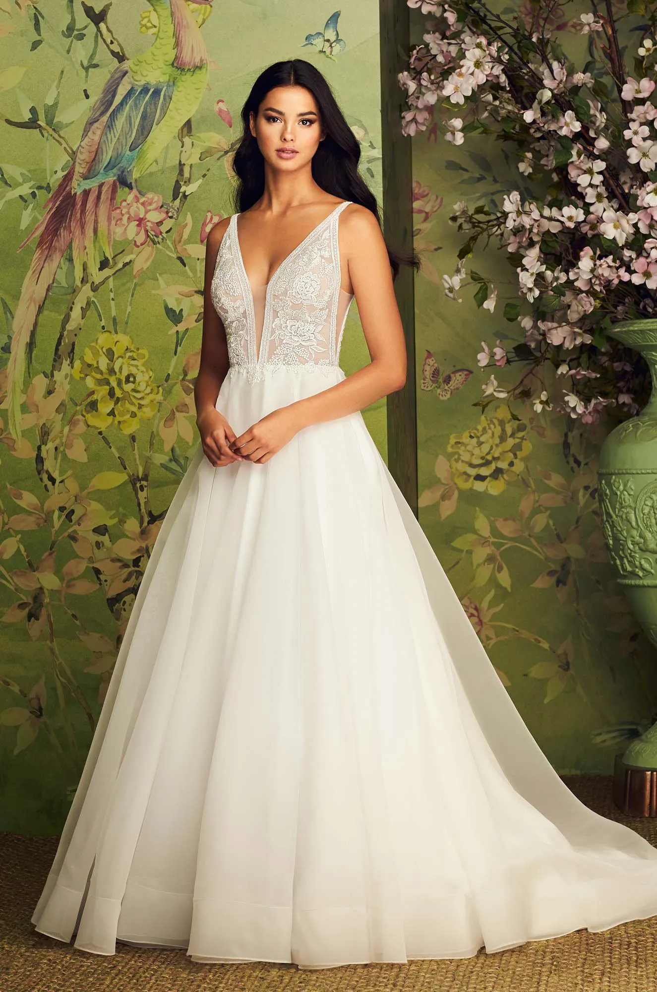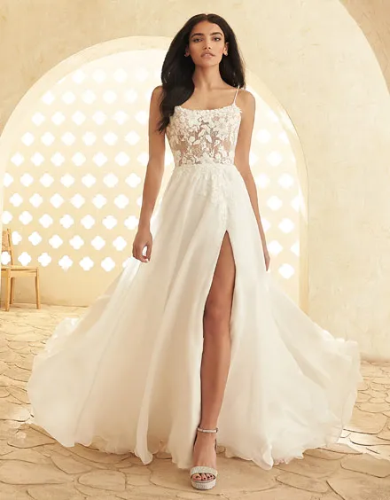 If your bottom half is an area that you would rather de-emphasize, choose a gown where the skirt skims over your hips and thighs. An A-line gown is your best option.