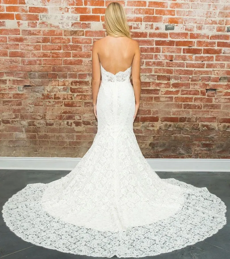The strapless neckline is expertly finished with a delicate lace scallop, and an opulent beaded belt has been added to further enhance the waist line. Style 4797 is lined in Pearl Lining so the floral lace pattern will stand out, but is also available with Latte Lining for more contrast, or Natural Lining for a tone on tone look. But can we talk about that train? Two words: Back. Goals.