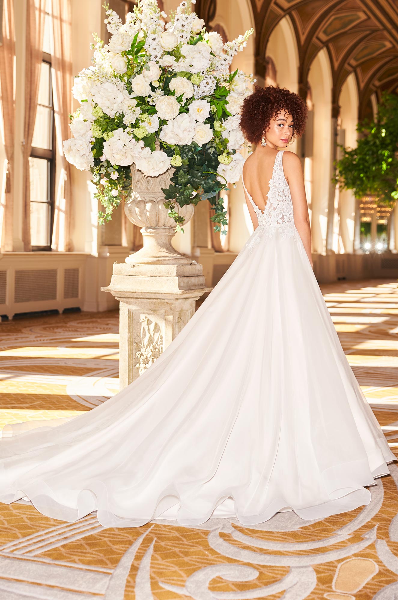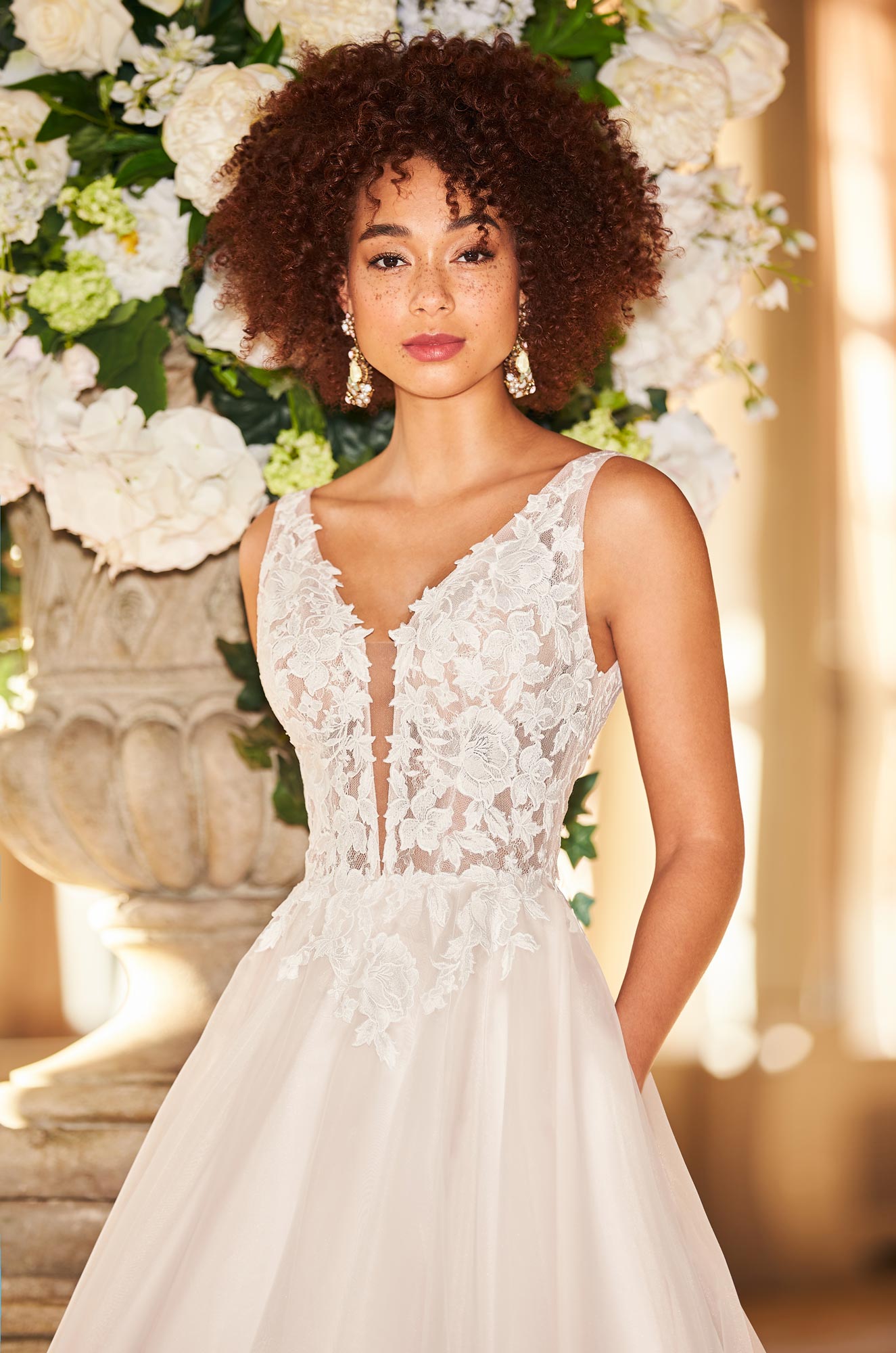 Sleeveless Chantilly Lace bodice with plunging neckline lined with Blush Italian Tulle. Guipure Lace appliqués scattered on bodice and cascading on to skirt. Full Organza skirt with pockets and 4” horsehair on hem. Shown in Natural Lace and Natural Organza with Blush Italian Tulle on bodice and Latte Lining on skirt. Also available in Natural Lining (Lace colour remains the same).
