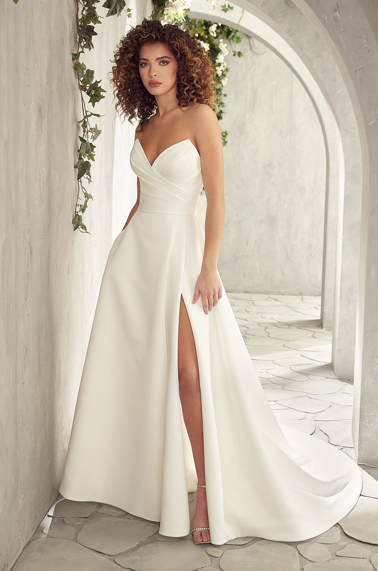 Strapless draped Satin Faille bodice with separate puff sleeves. Fabric covered buttons down center back to waist. Asymmetric bow at back. Full Satin Faille skirt with skirt slit and pockets. Shown in Natural.