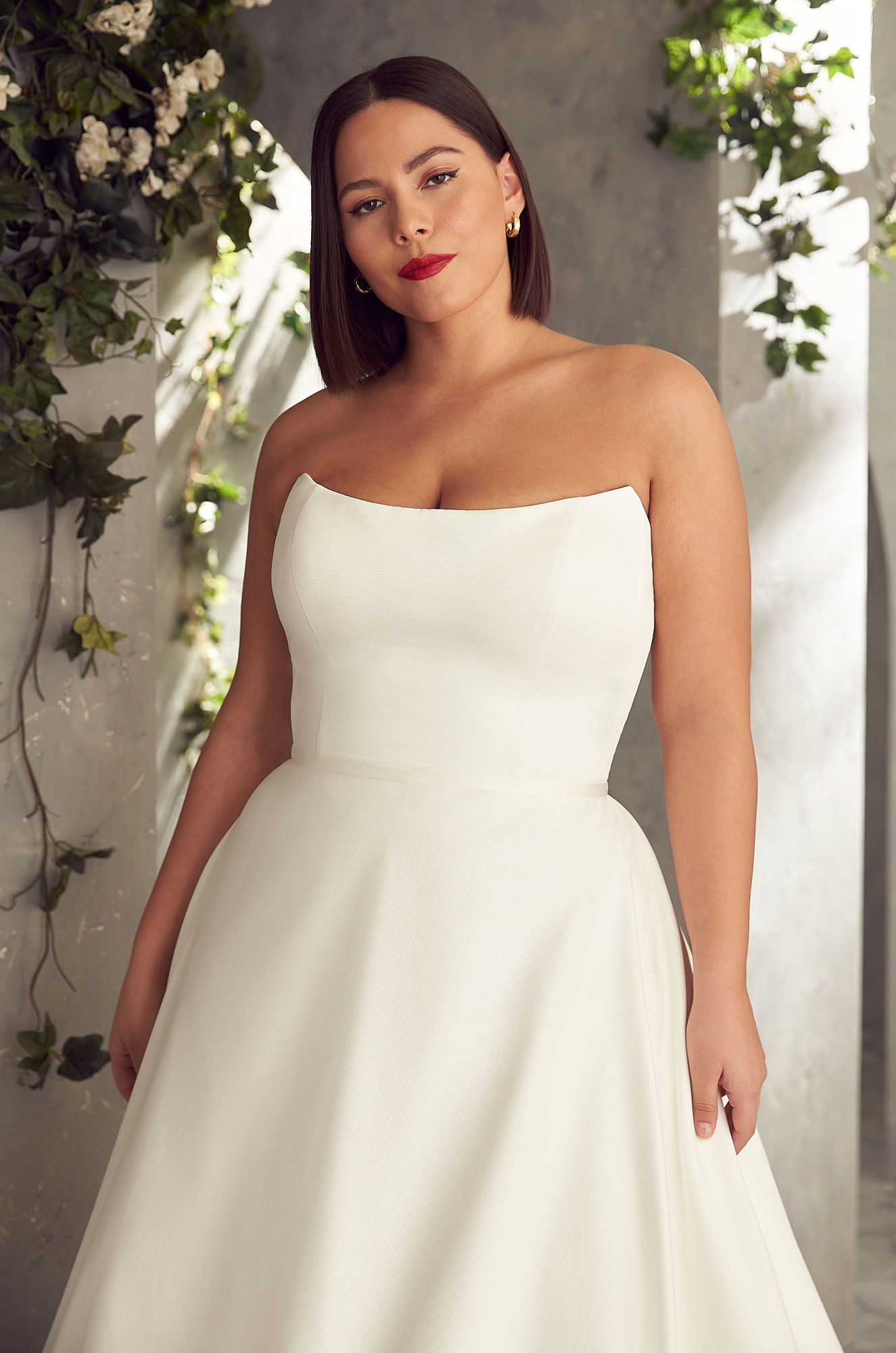 Strapless Satin Faille gown with scoop neckline and Natural Italian Tulle back on bodice. Satin Faille bias along back neckline with exposed boning on back. Fabric covered buttons down center back to waist. Full Satin Faille circle skirt with pockets. Shown in Natural.
