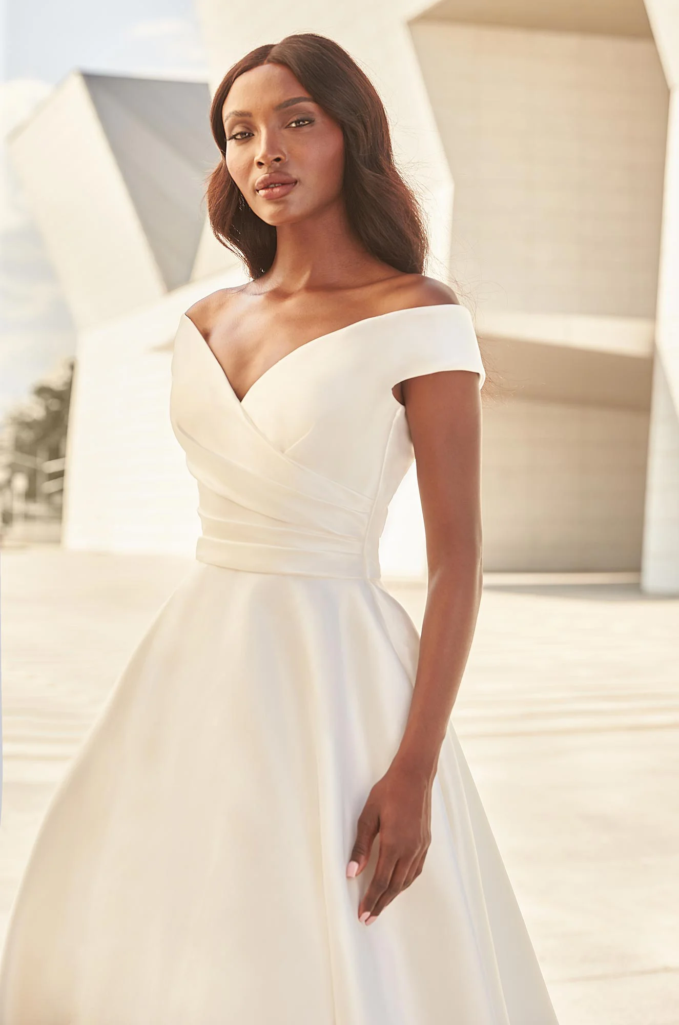 Draped Mikado with off the shoulder bodice. Fabric covered buttons down back bodice. Full Mikado circle skirt with pockets. Shown in Diamond.
