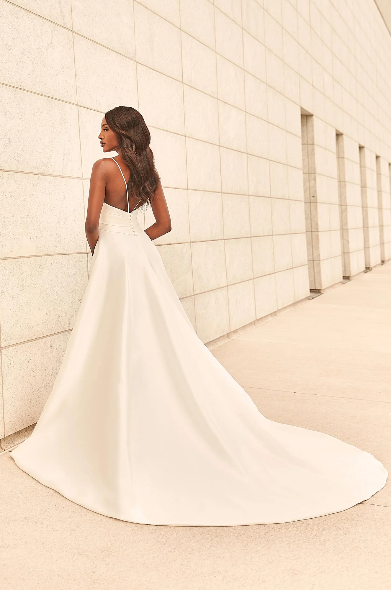 Lightly draped Mikado bodice with shallow scoop neckline and spaghetti straps. Fabric covered buttons down back bodice. Full Mikado wrap skirt with side front opening and side seam pockets. Shown in Diamond.