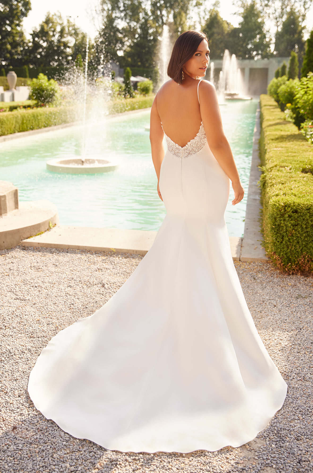 Princess cut Crepe gown with scoop neckline and spaghetti straps. Removable cowl back. Paloma Beaded Lace back. Fit and flare Crepe skirt with side slit. Shown in Natural.