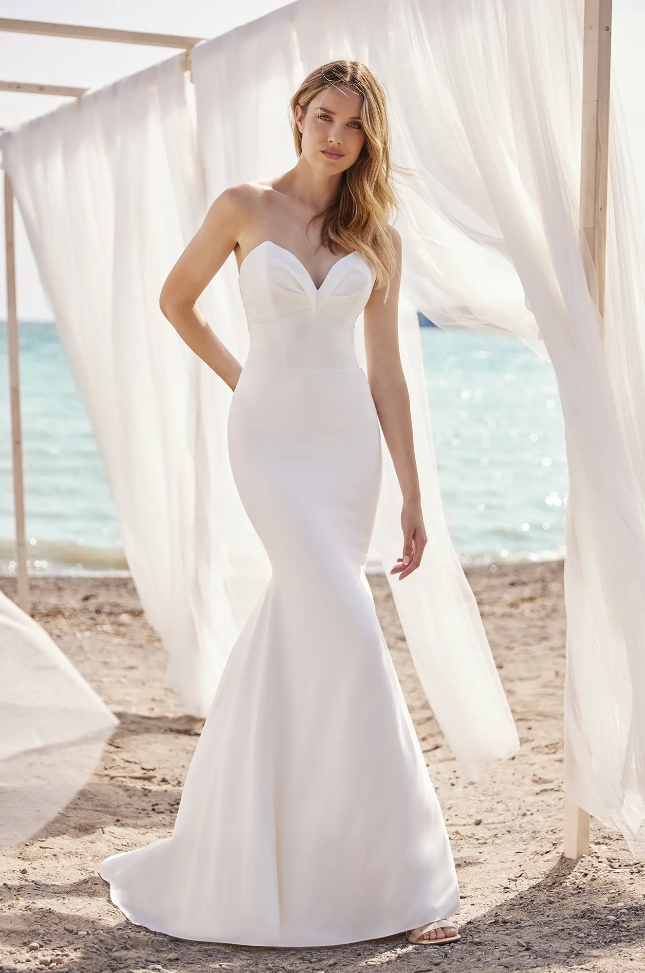 Strapless draped bodice with sweetheart neckline. Corset back lined in Italian tulle and ruched tulle. Fabric covered buttons down center back to waist. Detachable ruched tulle sleeves. Fit and flare Crepe skirt. Shown in Natural.