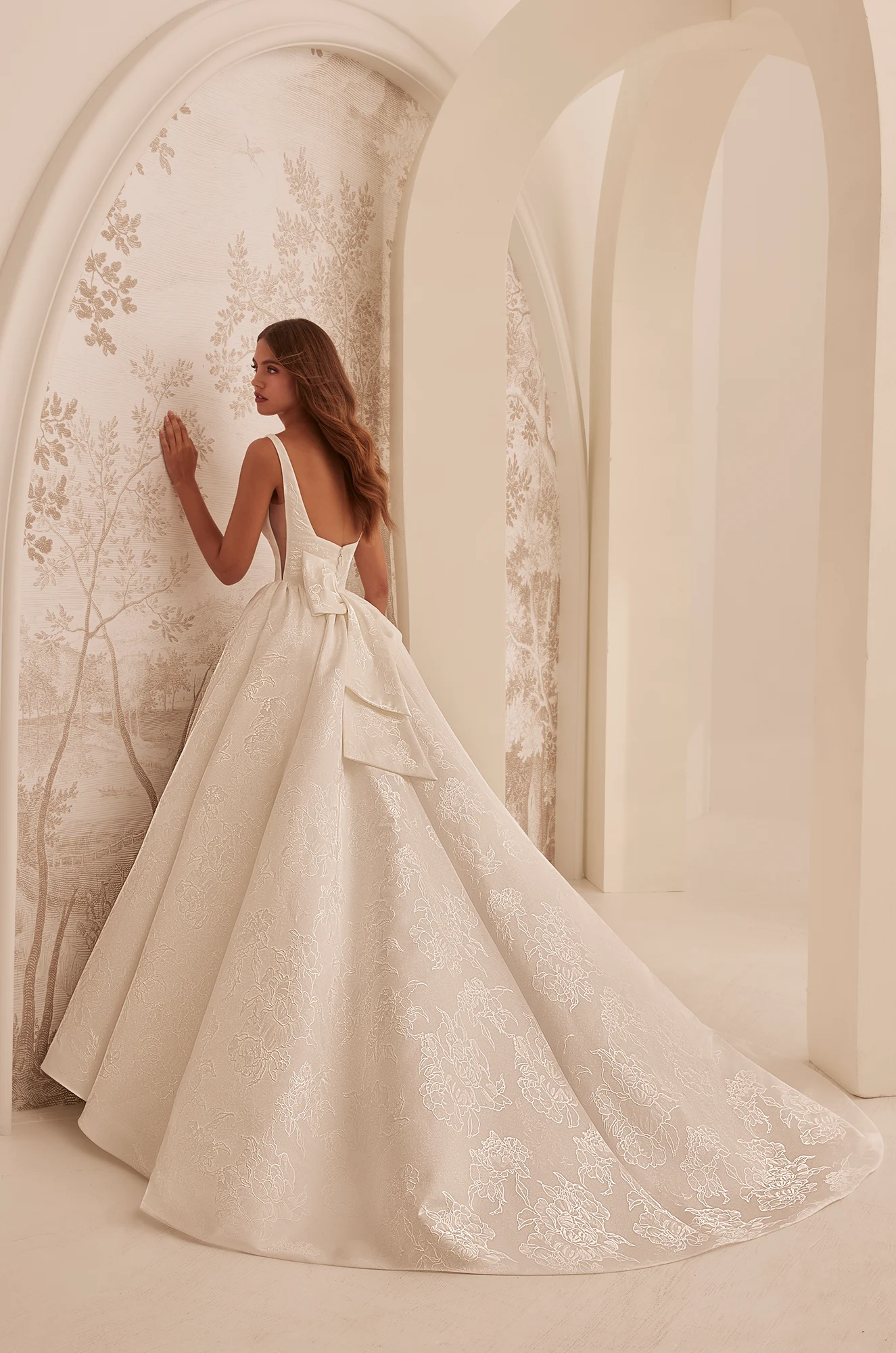 Sleeveless Jacquard bodice with slight scoop square neckline and Natural Italian Tulle side inserts. Fabric covered buttons down center back to waist. Full gathered ballgown skirt with flat center front panel, pockets, and Basque waistline. Detachable back bow detail. Shown in Natural.