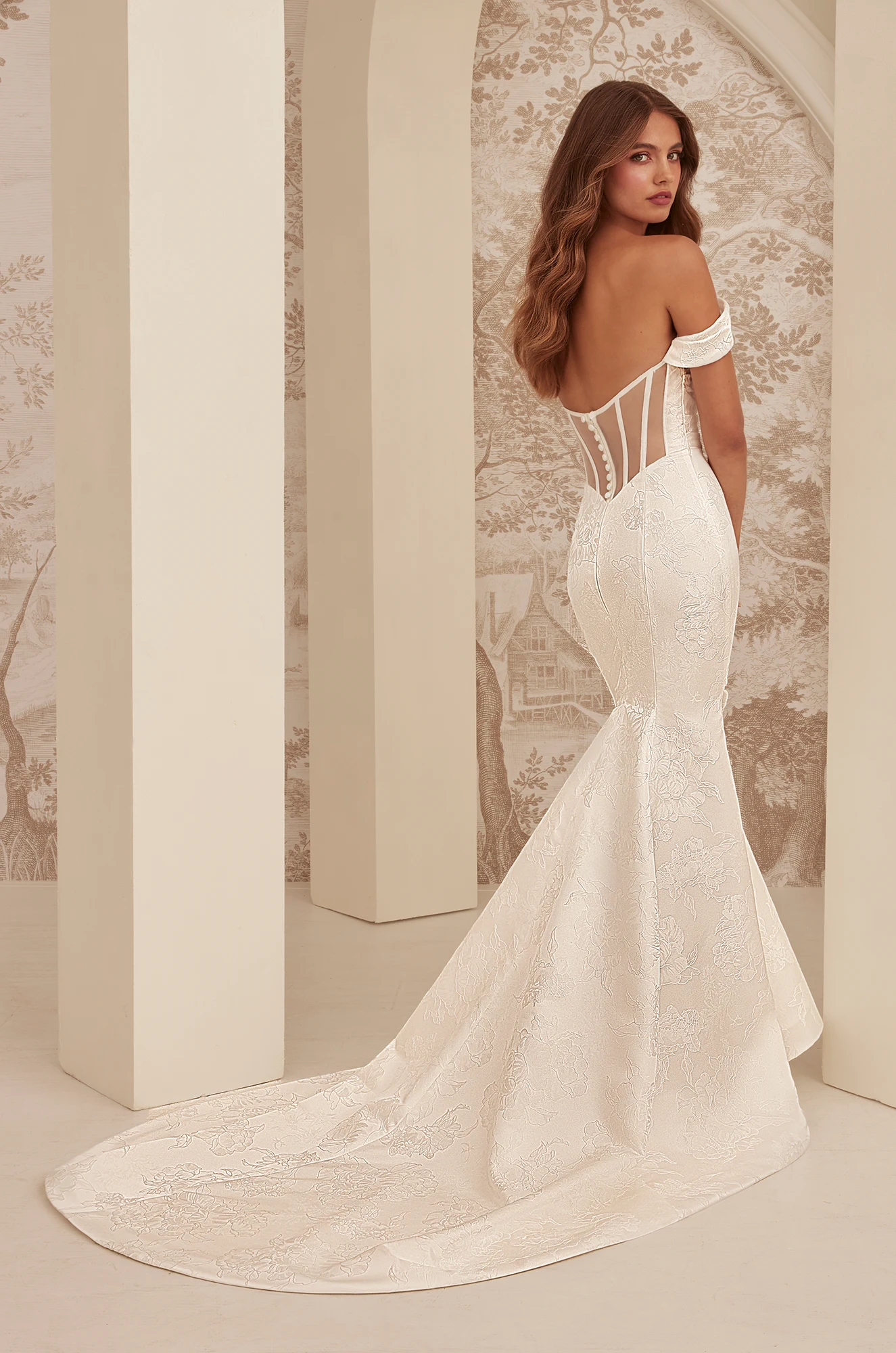 Draped Jacquard bodice with scoop neckline and detachable draped Jacquard sleeves. Natural Italian tulle back panels with exposed boning. Fabric covered buttons down center back to waist. Fit and flare Jacquard skirt with side slit and Basque waistline. Shown in Natural.