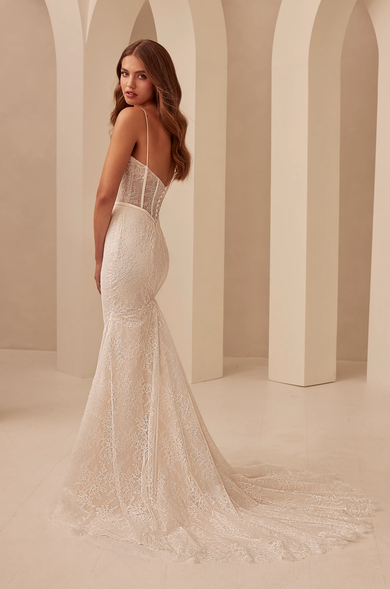 Chantilly Lace corset bodice lined with Natural and Blush Italian Tulle, exposed boning and Chantilly Lace draped neckline. Spaghetti straps and narrow band at waist. Fabric covered buttons down center back to waist. Chantilly Lace fit and flare skirt with inverted seam at back of train and scalloped hem. Shown in Natural Chantilly Lace, Soft Blush Regular Lining, Natural and Blush Italian Tulle. Also available in Natural Regular Lining with Natural Italian Tulle (Chantilly Lace colour remains the same).
