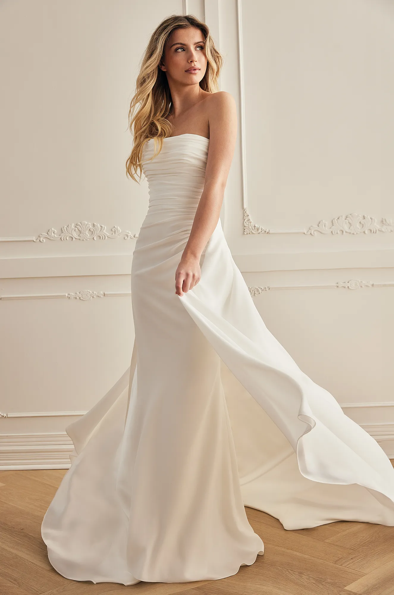 Strapless ruched crepe wedding gown with a straight-across neckline and drop-waist silhouette, flowing into a fit-and-flare skirt. Fabric-covered buttons trail down the center back to the waist, finished with a belted, matching detachable overskirt. Shown in Natural.