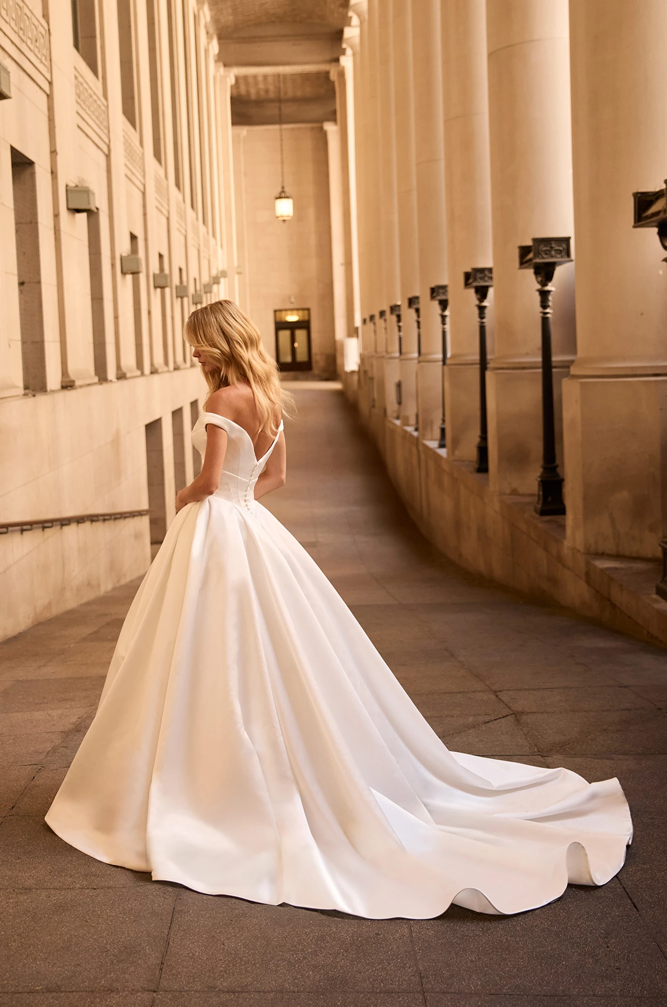 Off the shoulder bodice with plunging V-neckline and banded corset with basque waistline. Fabric covered buttons down center back to waist. Full box pleated ballgown skirt with pockets. Shown in Diamond.