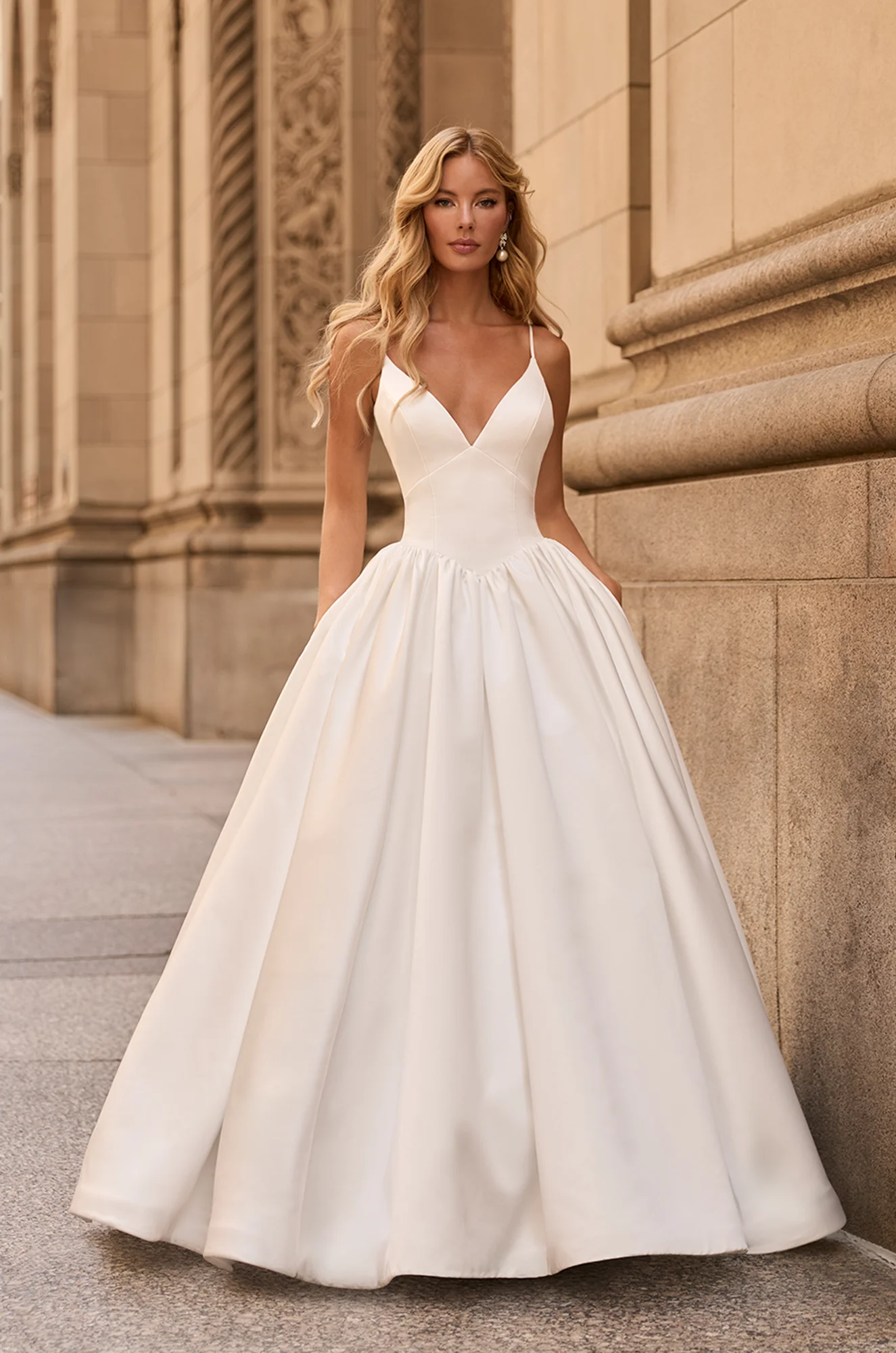 Duchesse Satin gown with V-neckline and spaghetti straps. Fabric covered buttons down center back to waist. Full gathered ballgown skirt with pockets and basque waistline. Shown in Diamond.