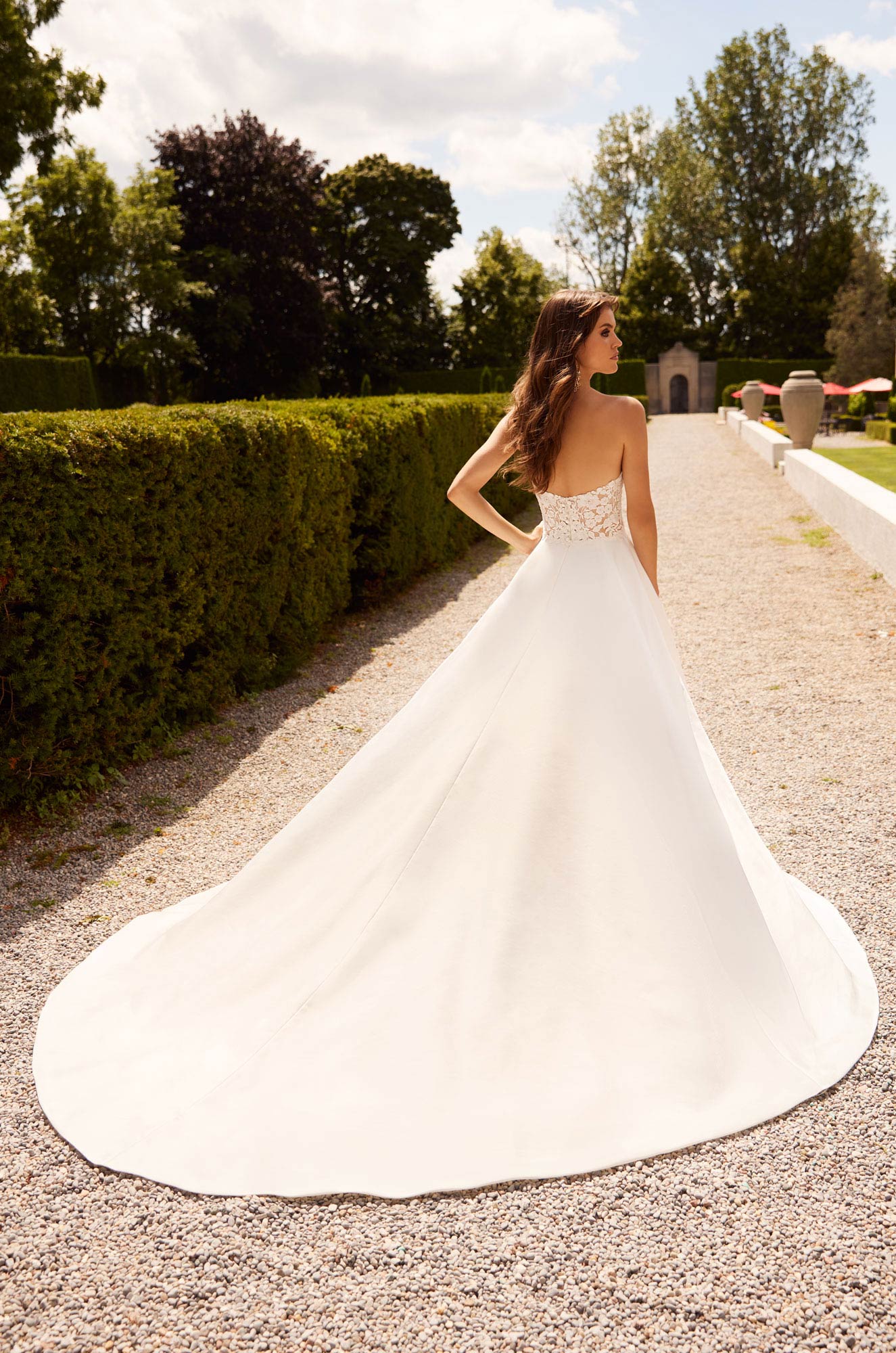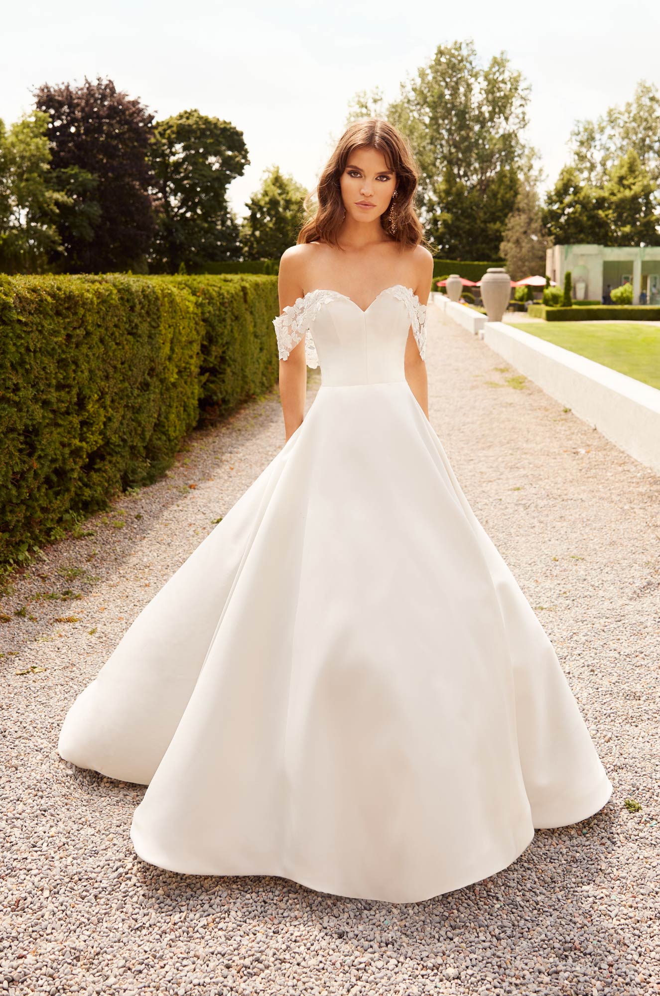 Strapless Mikado bodice with sweetheart neckline and removable Sequin Lace off the shoulder portrait collar. Portrait collar worn off the shoulder and also strapless with pleats snapped in the back. Sequin Lace back lined with Natural Italian Tulle on bodice and fabric covered buttons down center back to waist. Full Mikado circle skirt with pockets. Shown in Diamond.