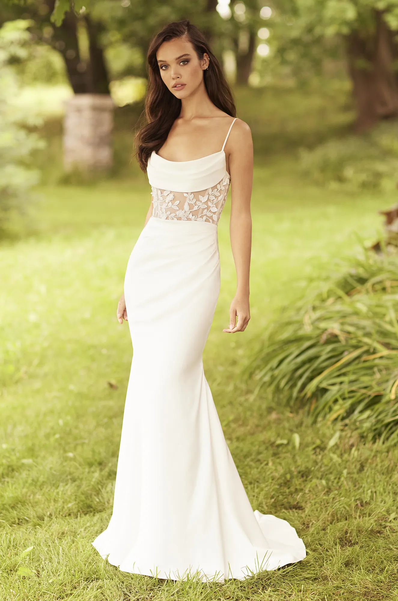 Spaghetti strap Charmeuse Satin bodice with scoop draped neckline. Cowl corset lined in Italian tulle with 3D flower lace appliques. Fabric covered buttons down center back to waist. Charmeuse Satin draped skirt. Shown in Natural.