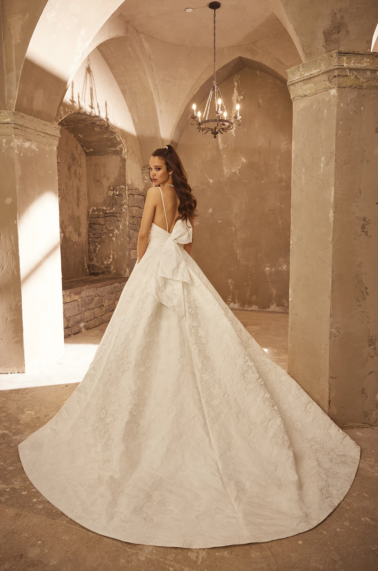 Draped bodice with sweetheart neckline and spaghetti straps. Full circle skirt with pockets. Detachable back bow detail. Shown in Natural.