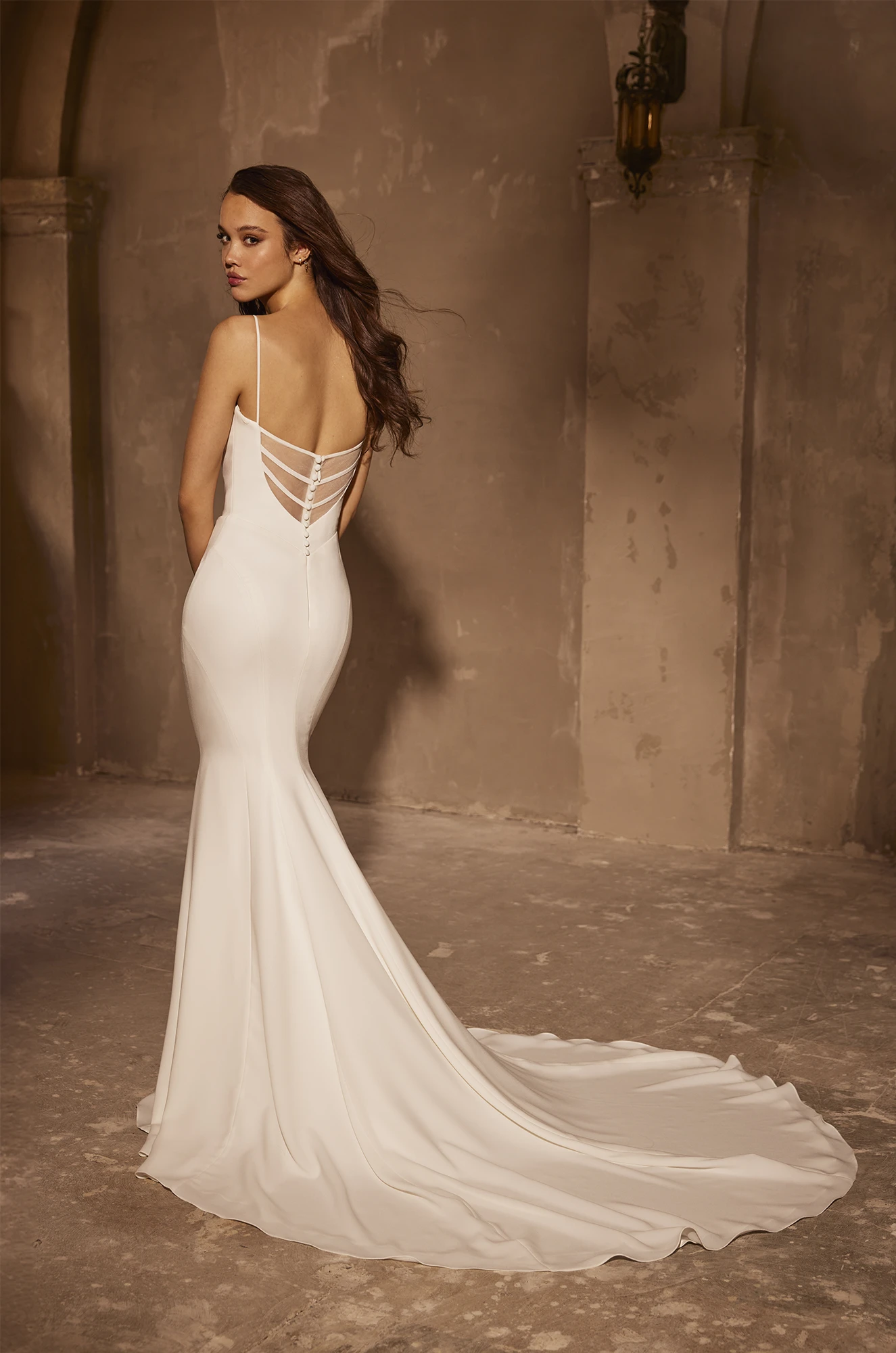 Crepe bustier bodice with hand-pleated bust cups, spaghetti straps and plunging V-neckline. Basque waistline and Italian Tulle back cut-out with Crepe bias detailing. Fabric covered buttons down center back to waist. Crepe fit and flare skirt with multiple shaped seams for exceptional fit. Shown in Natural.