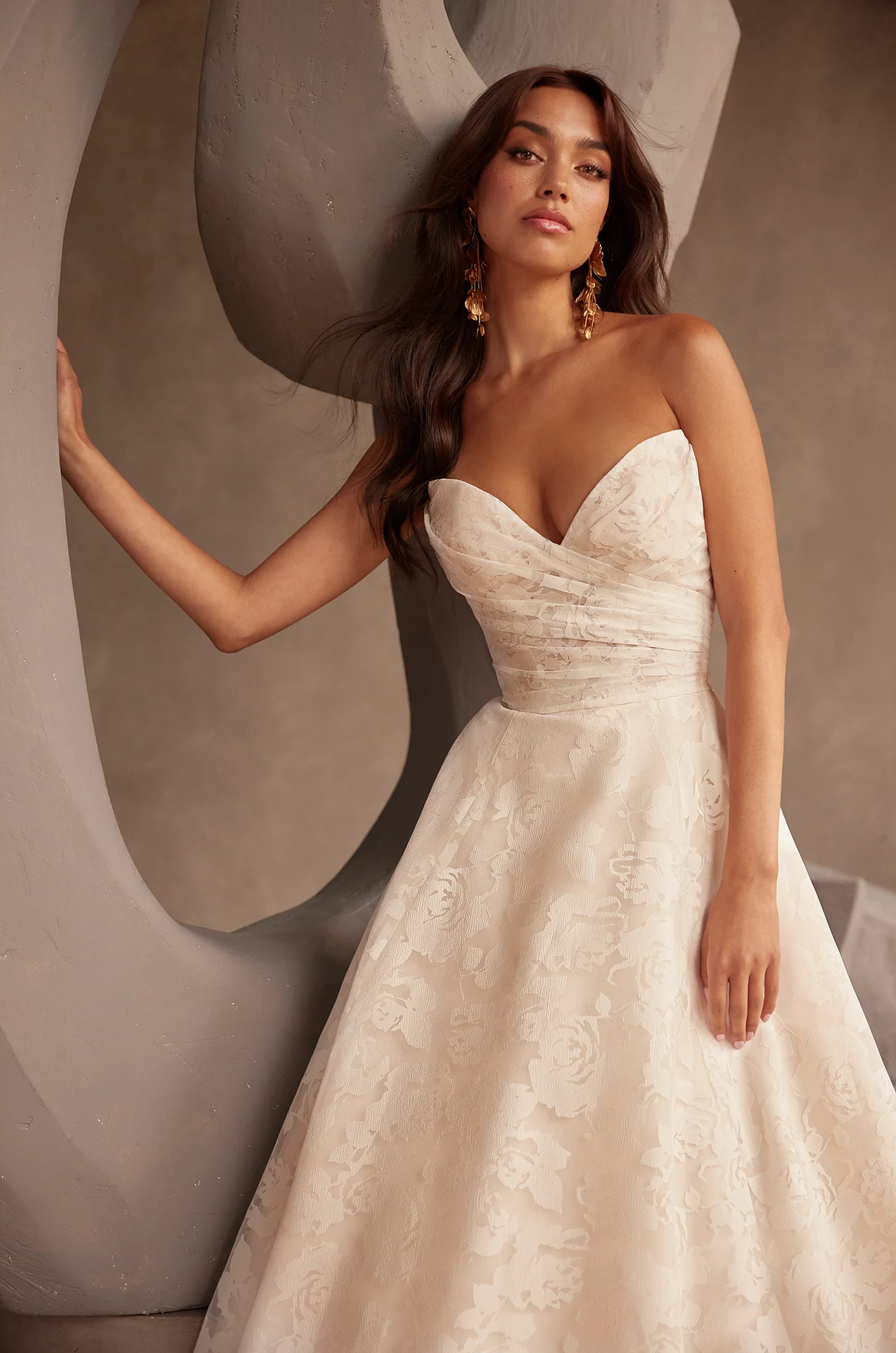 Strapless draped Burnout Organza bodice with sweetheart neckline. Fabric covered buttons down center back to waist. Full A-line Burnout Organza skirt with pockets and 4” horsehair hem. Shown in Natural Burnout Organza with Soft Blush Regular Lining. Also available in Natural Regular Lining (Burnout Organza colour remains the same).