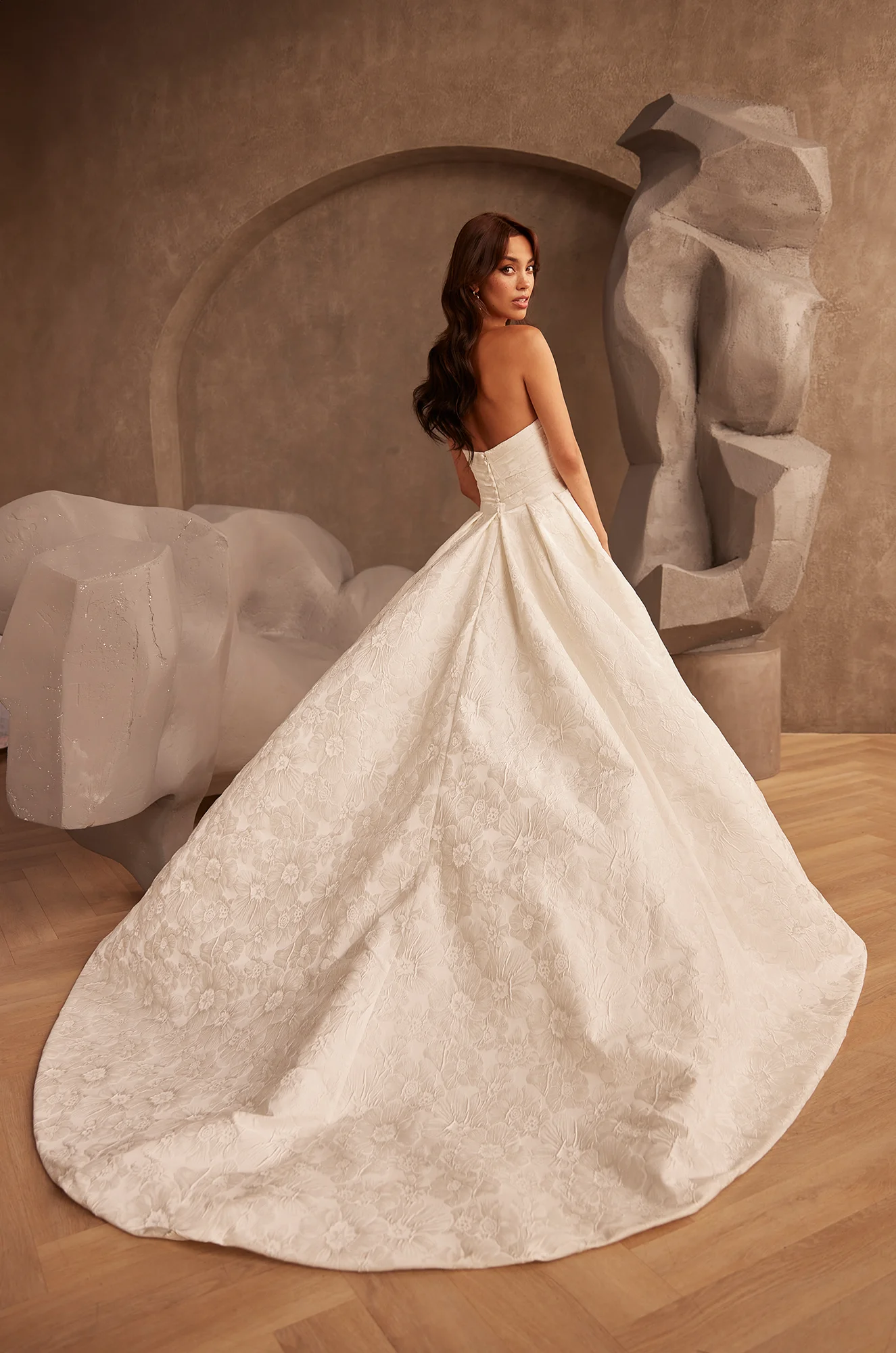 Strapless draped Brocade bodice with scoop neckline. Fabric covered buttons down center back to waist. Fit and flare Brocade skirt with belted detachable overskirt. Shown in Natural.