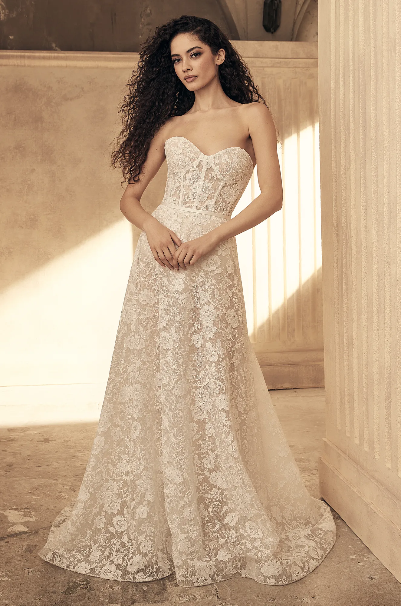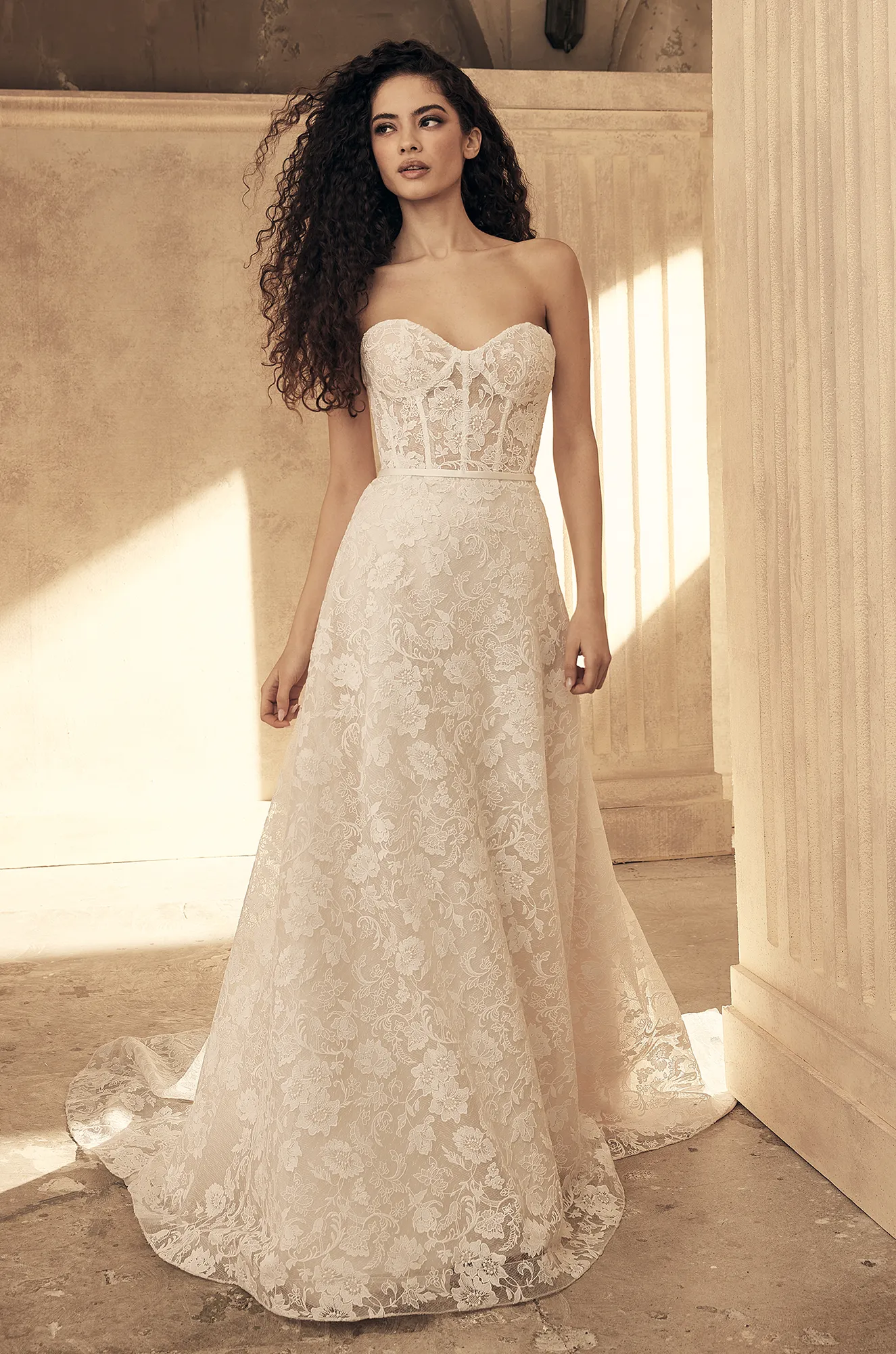 Strapless sheer lace gown featuring a sweetheart neckline with exposed boning for added structure. A narrow Duchesse Satin band cinches the waist, while fabric-covered buttons trail down the center back to the waist. The gown is available lined or unlined and is complemented by a lace and Organdy A-line skirt. Separate micro shorts and a skirt slip are also included for added comfort, convenience and versatility. Shown in Natural Guipure Lace with Soft Blush Lining skirt slip. Skirt slip also available in Natural Lining (Guipure Lace Colour remains the same).